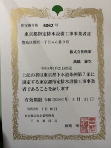 下水道局から認可頂きました。 ※指定日は21日 水道局も申請済みで、来週認可予定。 上下水道指定工事店となります。 日々精進、誠実に努めてまいります。